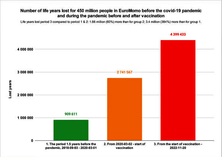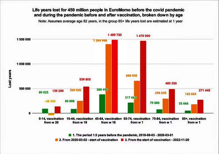 L’elaborazione delle statistiche EuroMomo sull’eccesso di mortalità in Europa, dimostra come i cittadini europei, dopo l’inizio della campagna vaccinale rispetto ai 18 mesi prepandemici, abbiano drammaticamento perso milioni di anni di vita.