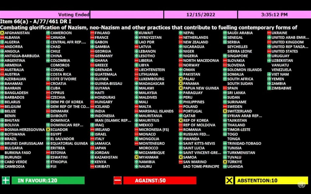 L’Assemblea generale delle Nazioni Unite (UNGA) ha adottato una risoluzione intitolata “Combattere l’esaltazione del nazismo, del neo-nazismo e di altre pratiche che contribuiscono ad alimentare le forme contemporanee di razzismo, discriminazione razziale, xenofobia e intolleranza correlata”, secondo un rapporto della TASS. 120 nazioni hanno votato a favore dell’adozione della risoluzione, 10 si sono astenuti e 50 nazioni hanno votato contro.